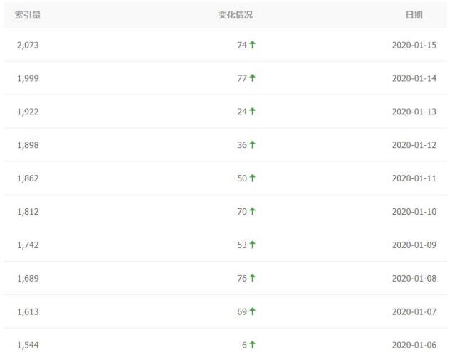 其次看近期的索引,如果出现持续的‘绿色’上升状态,也表明网站整体在搜索引擎上是有所好转的: