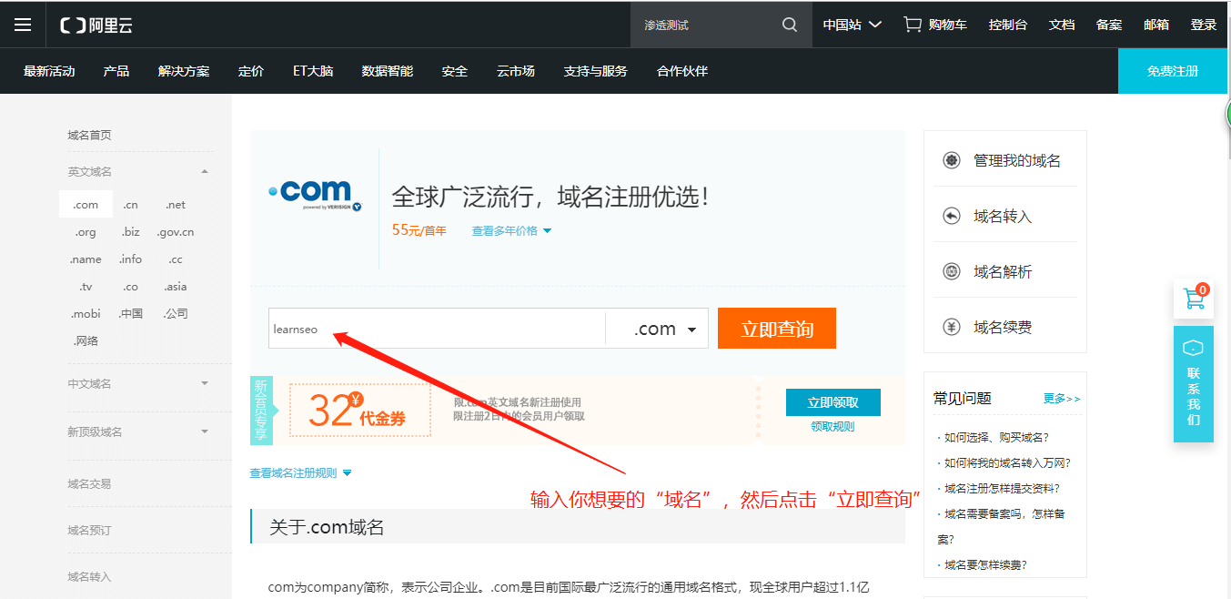 1.2、在搜索框输入你想要的“域名”,然后点击“立即查询”