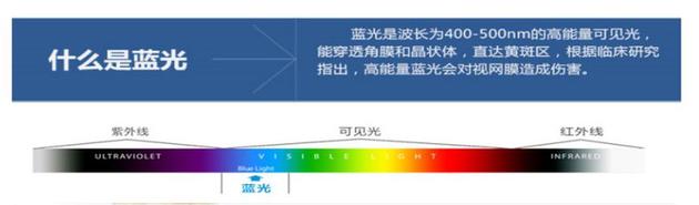 这提到的蓝光是波长为400-500纳米的高能量可见光,它可以穿透晶体达到视网膜,对其造成光学损害,且加速黄斑区细胞的氧化,而且这种损伤是逐渐积累而形成的。因此,蓝光被研究证实是最具危害的可见光。