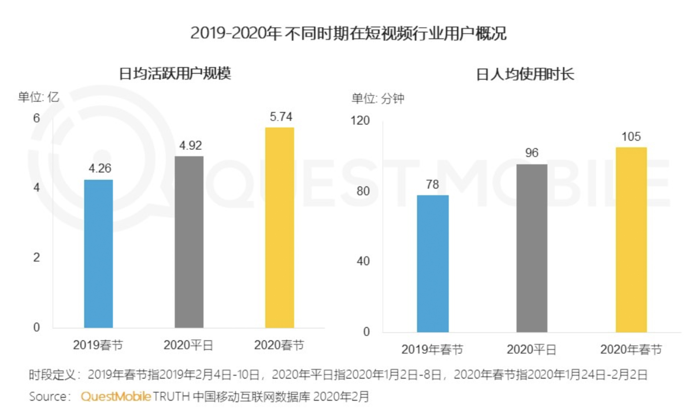 根据QuestMobile 最新数据显示,受疫情影响,短视频在近期成为广大网民主要放松方式之一,也是网民了解疫情、学习防护知识的重要平台,用户、时长都增幅明显。