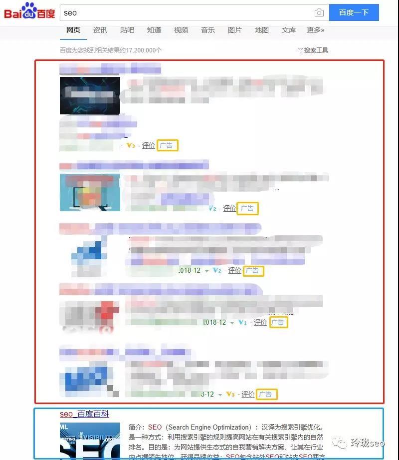 为了避免打广告嫌疑,敏感信息打了马赛克。可以看到红框中都是sem的展示结果,每一条记录分别都被打上了“广告”的字样,也就是说他们都是参与搜索引擎官方付费推广的,你点击一次他们的网站,他们就要花掉一笔推广费用。这也是人民币玩家的游戏。而篮框中的seo百度百科结果便是seo优化做上来的第一名。举个这样的例子大家能更好的理解seo和sem的区别了吗?