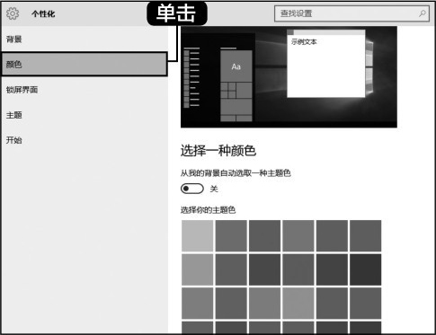 设置桌面颜色。单击【颜色】选项,可以让Windows 从背景中抽取一个主题色,也可以自己选择喜欢的主题色。
