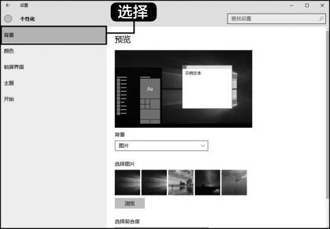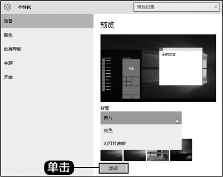 设置桌面背景。桌面背景主要包含图片、纯色和幻灯片放映3种方式,用户可在图片缩略图中,选择要设置的背景图片,也可以单击【浏览】按钮,选择本地图片作为桌面背景。