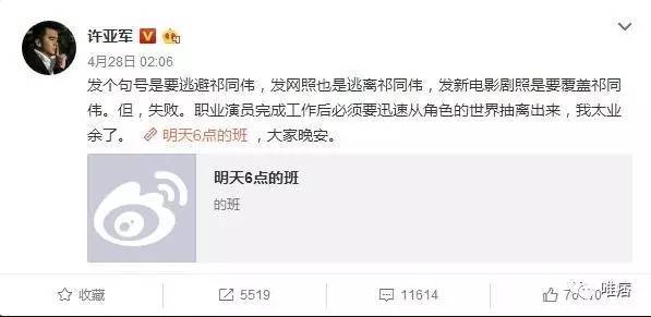 许亚军自己也出不了戏。他在微博写道:发个句号是要逃避祁同伟,发新电影剧照是要覆盖祁同伟。但,失败。职业演员完成工作后必须要迅速从角色的世界抽离出来,我太业余了。