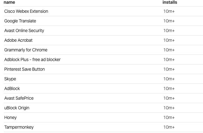 实际上,超过1000万次安装的扩展只有13件,分别是Google Translate, Adobe Acrobat, Tampermonkey, Avast Online Security, Adblock Plus, Adblock, uBlock Origin, Pinterest Save Button, Cisco Webex, Grammarly for Chrome, Skype, Avast SafePrice和Honey。