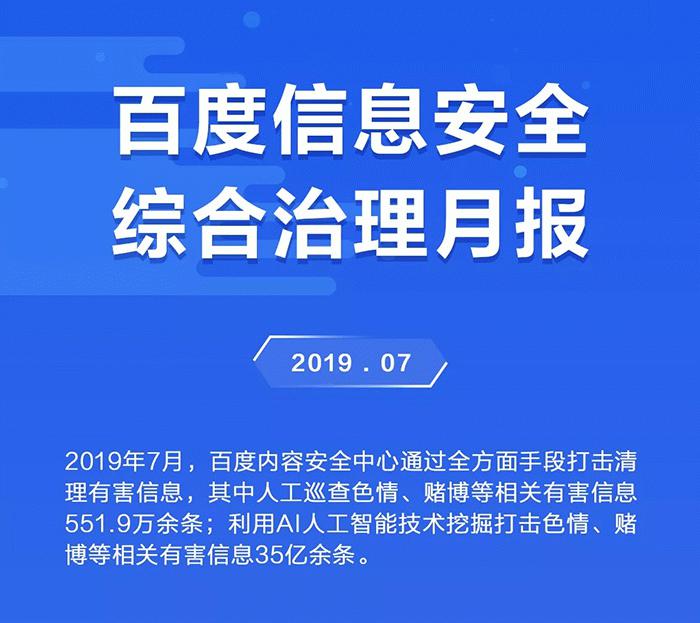 百度发布7月信息安全综合治理月报,利用AI人工智能技术挖掘打击色情、赌博等相关有害信息35亿余条。具体内容请关注今天的小熊微科技【每日必读】栏目。