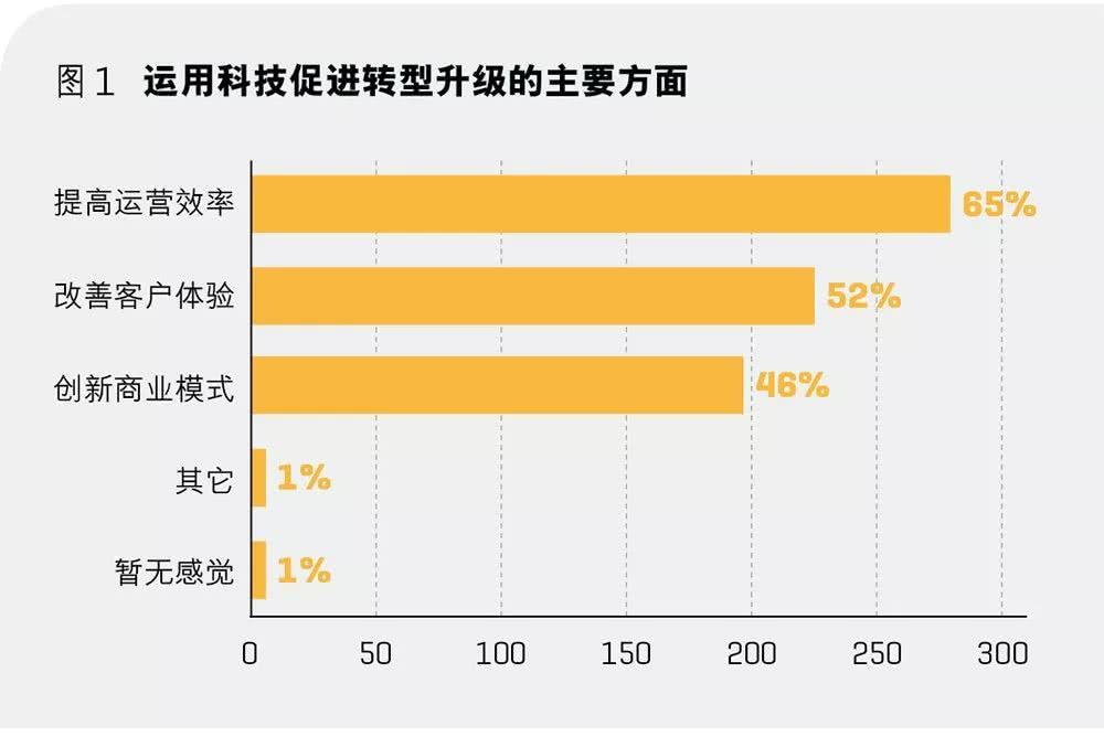 实际上,数字化转型在中国各行业领先企业中已经成为普遍实践。我们在本次最受赞赏企业评选中加入了附加问卷,其中,关于“运用科技促进转型升级的主要方面”这一问题上,几乎所有投票者都选择了前三个方面:提高运营效率、改善客户体验、创新商业模式。超过一半的投票者至少选择了其中的两项甚至三项,显示出多浪叠加正在同步影响中国企业,而中国企业正在运用新手段同步解决三个层次的问题。从提质增效,到获取增量客户,再到创造全新的价值,是非连续性的过程,需要企业不断突破既有的心智模式,只有拥有颠覆性创新意识与能力的企业,才有可能不断吐故纳新、腾笼换鸟、拥抱未来。