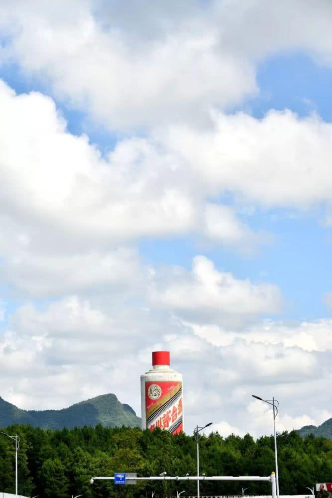 2019年8月8日,在贵州省遵义茅台机场拍摄的茅台酒酒瓶巨型雕塑。图片来源:视觉中国