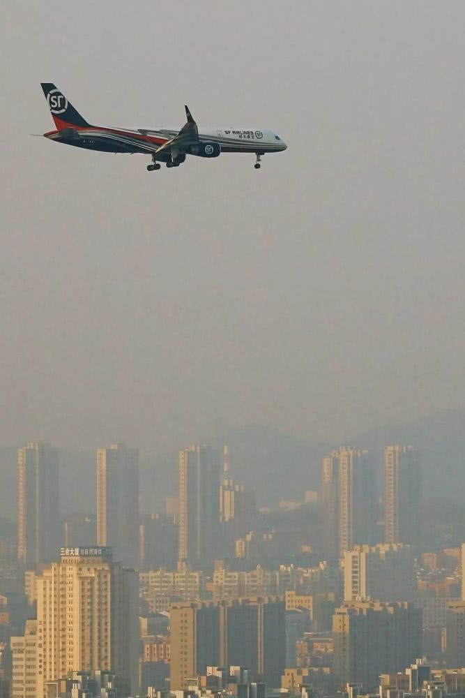 2019年4月4日早晨,一架顺丰航空全货机即将在大连机场着陆。图片来源:视觉中国
