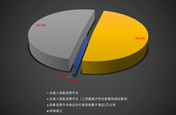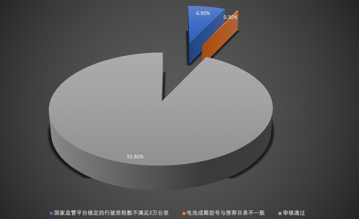 其申报的轿车中,总申报数为23766辆,核减原因为“电池成箱型号与推荐目录不一致”的为72辆,因为“国家监管平台核定的行驶里程数不满足2万公里”的有1639辆,通过率为92.8%。