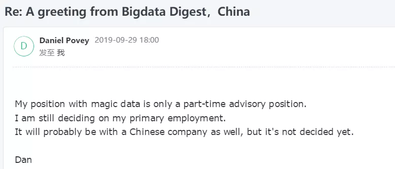 文摘菌收到这个消息之后第一时间与Daniel Povey取得联系,他表示这只是他的一个兼职,全职工作也可能选择一家中国企业。