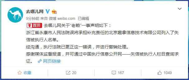 去哪儿网回应被浙江一法院列为"老赖" :系乌龙,法院已纠正