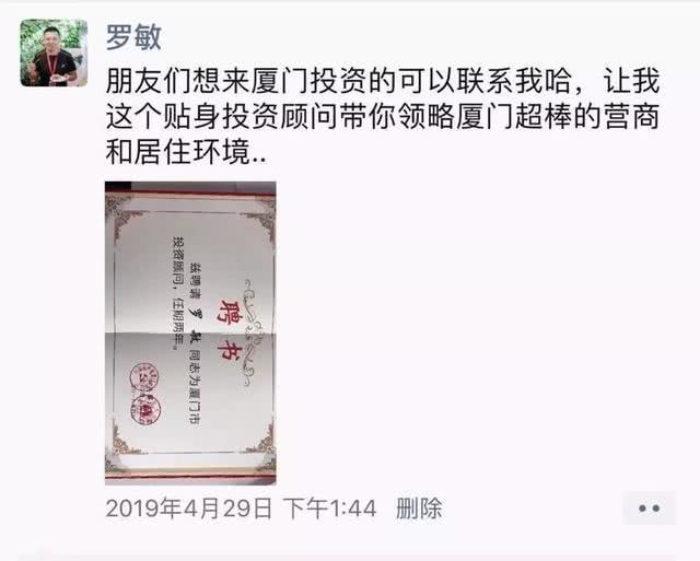 2019年4月,罗敏获得厦门市投资顾问的身份,任期两年。他第一时间在朋友圈里晒出任命书,并表示想来厦门投资的朋友可以联系他。