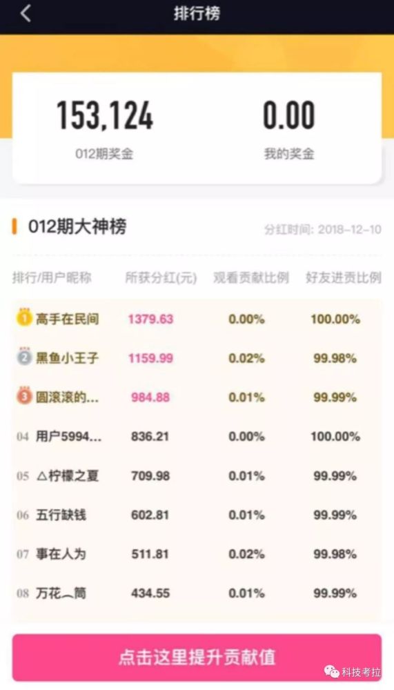 这把杀手锏也被复制到了趣多拍上。去年更新上线的趣多拍上设置有贡献值机制,贡献值可参与当期现金分红,用户的邀请好友、观看视频、点赞、评论等行为都可以获得贡献值。