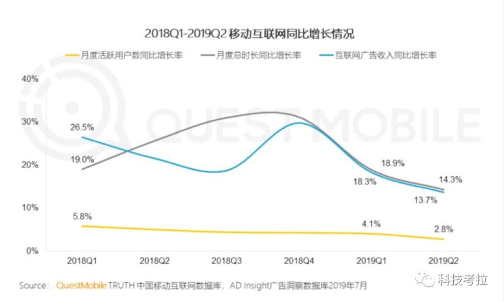 根据QuestMobile发布的《中国移动互联网2019半年大报告》显示,第二季度移动互联网月活跃用户首次下降近200万。