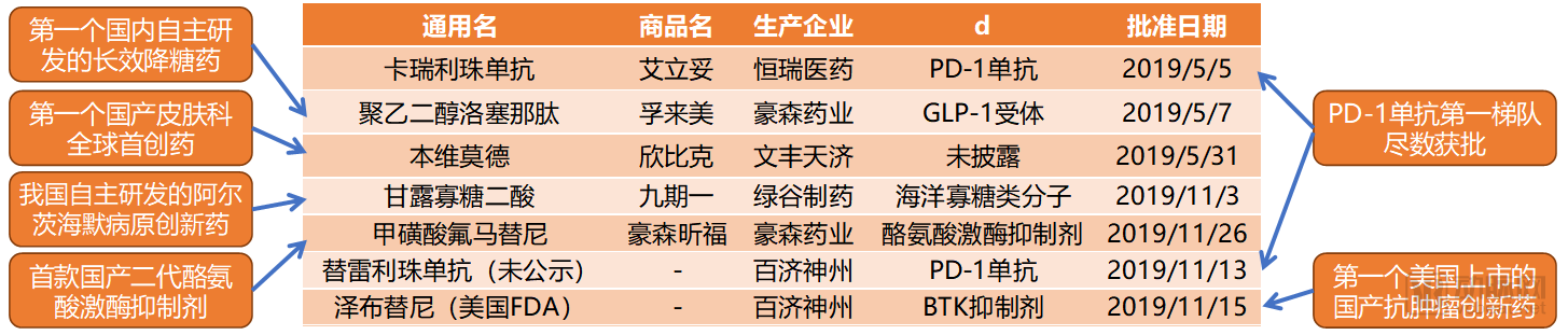 随着2019年大分子生物类似药开闸,2020年会有更多生物类似药获批。在利妥昔单抗和阿达木单抗的首款产品获批之后,其他重点品种的生物类似药很可能会在2020年逐步被获批。更多创新药品种进入国产化序列。