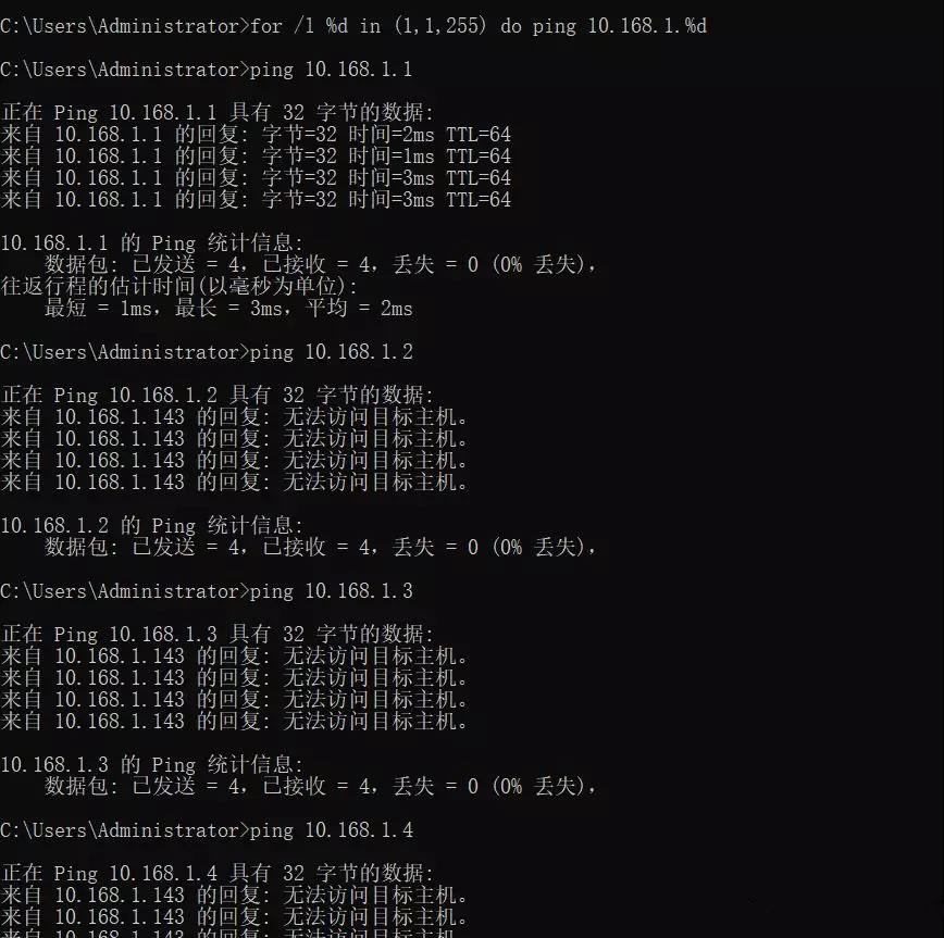 先看代码,直接在命令行窗口输入:for /L %D in (1,1,255) do ping 10.168.1.%D