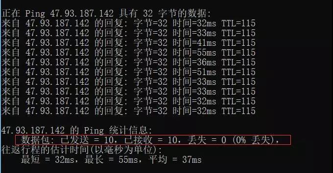 从以上可以知道在给47.93.187.142发送10个数据包的过程当中,返回了10个,没有丢失,这10个数据包当中返回速度最快为32ms,最慢为55ms,平均速度为37ms。说明我的网络良好。