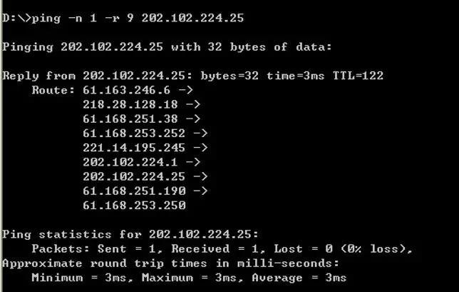 路由个数,但最多只能跟踪到9个路由。ping -n 1 -r 9 202.102.224.25 (发送一个数据包,最多记录9个路由)
