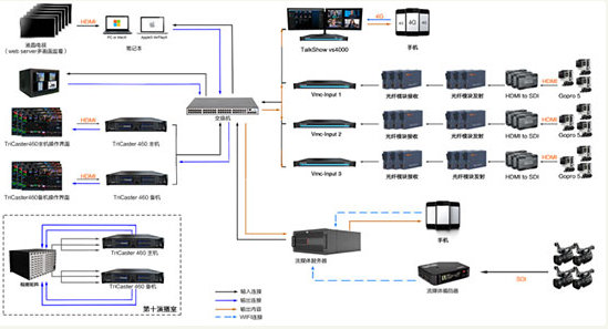 有了千视NDI解决方案,这些问题便迎刃而解,只要在前方架设一台无线路由器和数台千视编码器。 摄像机则可以通过千视电子编码器设备,直接将输出的SDI或HDMI转换成NDI信号,通过网线或Wifi传输,同样可被局域网中的导播电脑接收。这样就算不依靠昂贵的图传设备,也能实现摄像机的自由移动,并确保视频高清、低延时、无卡顿传输。