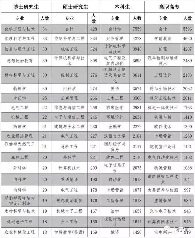 毕业生数量最多的二十个专业