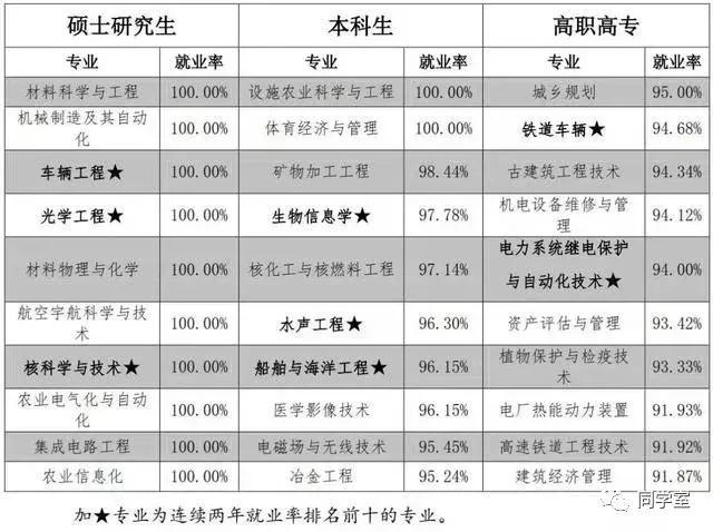 ■ 就业率排名前十名的高职高专专业有:铁道车辆、电力系统继电保护与自动化技术。