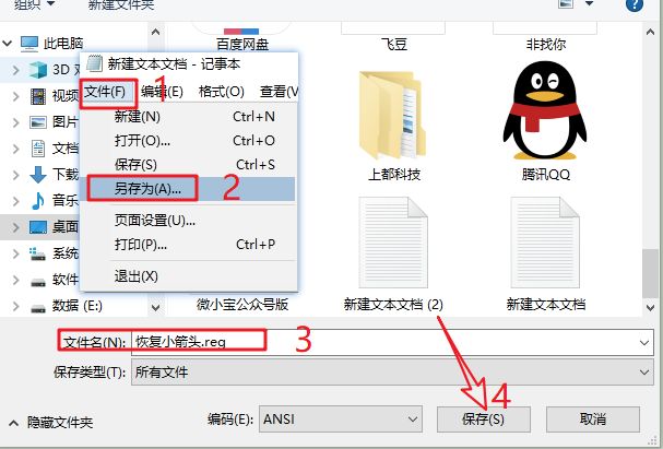 2.点击【文件】选择【另存为】,文件名填写【恢复小箭头.reg】(注意:.reg后缀一定要加上)点击【保存】。