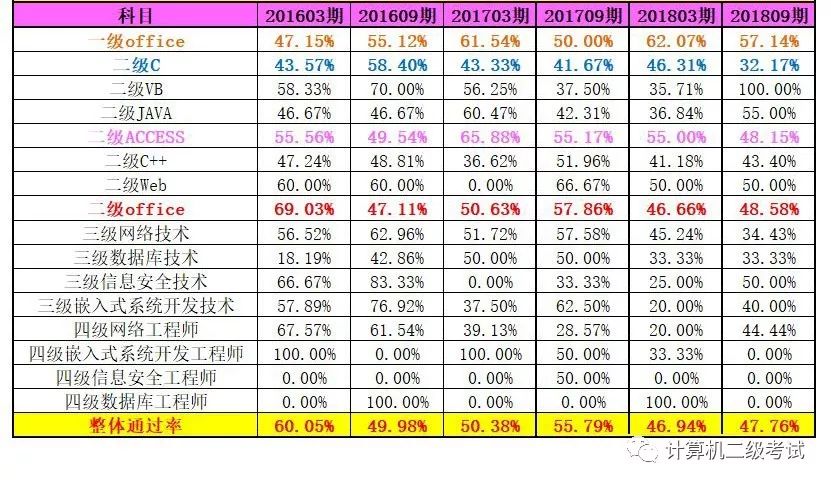 通过最近6次各科目考试的通过率情况,我们可以了解到各科目的考试难度,做到心中有数!