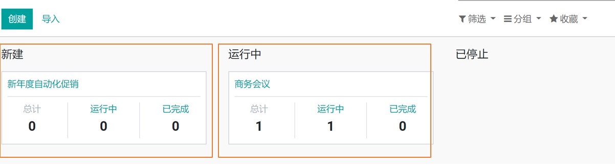 首先介绍的是营销方案看板,在这里可以按照状态,查看所有的自动化营销方案: