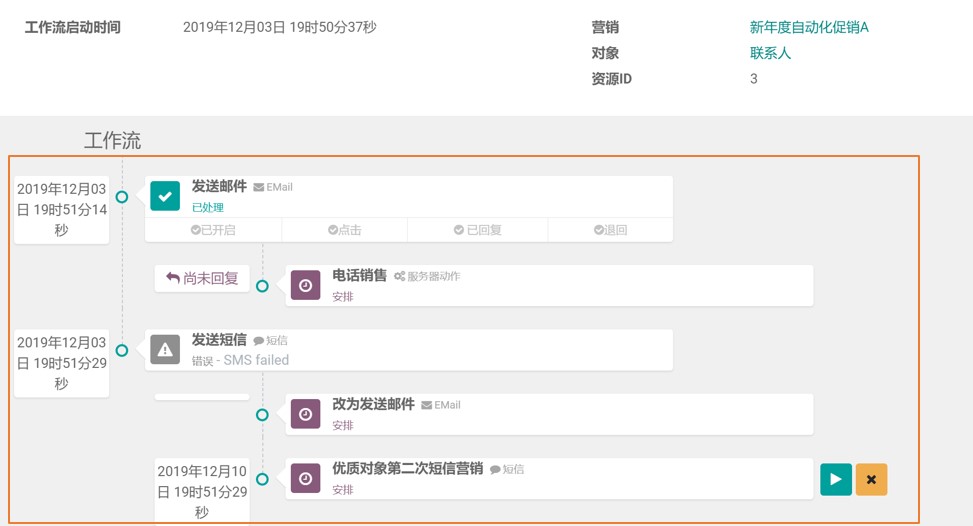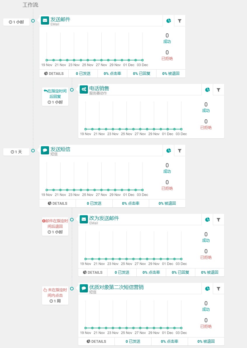 如上图,本SaaS营销方案中包括两轮营销,第一轮为邮件营销,如果客户在指定时间内回复邮件,则触发其子任务,也即给电话销售派发活动,进行人工的电话销售。第二轮为短信营销,如果短信未被成功发送,则触发子任务,改为发送邮件。如果客户在制定时间内未查看短信,则筛选出一批优质客户,进行第二次的短信营销。