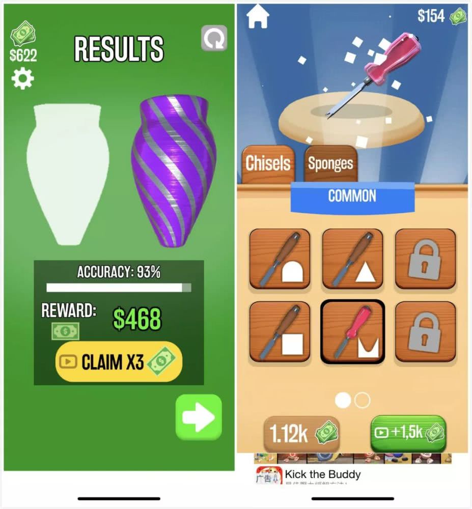 变现方面同样是广告变现为主,以激励视频、插屏广告、banner相结合。激励视频主要用于关卡结算时获得更多金钱奖励,以及解锁新的图案。金钱可用于解锁更多形状的凿子,以便于完成更多形状的目标。