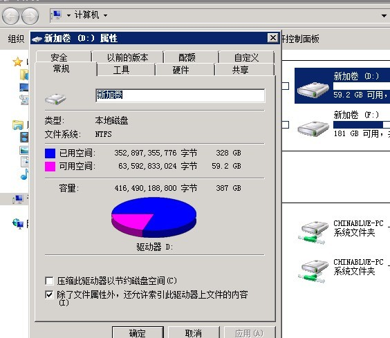 从上图中可以看出D盘的己用空间为387GB,而可用空间仅为59.2G。