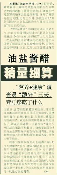 2002年,北京市疾病预防控制中心又从全市随机抽出1240户家庭做营养和健康状况测查,通过每天的食物和营养素摄入量、饮食习惯等信息,了解本市居民的营养状况和与其相关的慢性病发病情况。(2002年8月19日《北京日报》5版,《油盐酱醋精量细算》)