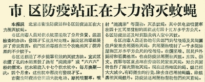据本报1956年9月6日2版《市、区防疫站正在大力消灭蚊蝇》报道,市卫生防疫站出动大批电动喷雾车、摩托喷雾车,喷射“滴滴涕”等药物,灭杀蚊蝇,其中仅电动喷雾车在45天里喷射的面积就有45万多平方米。各区消毒人员还协助有关部门到垃圾场及其周围住户家里去用药物灭蝇,共用药物喷射了1000多间房屋和3万多平方米的垃圾场。在烂菜堆、居民户外厕所和蓄粪池里,也由防疫站用药物灭蛆。