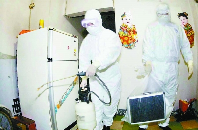 2003年,崇文区疾控中心流调队员在非典患者家中消毒。贾同军/摄