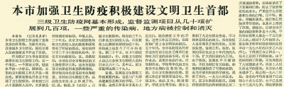 新中国成立后,北京非常注重卫生防疫工作,很快消灭了天花和回归热,防止了鼠疫和霍乱的发生。严重危害儿童健康和生命的白喉、百日咳、麻疹、脊髓灰质炎等传染病,也基本上得到控制。到上世纪50年代中期,全市卫生防疫重点转向麻疹、痢疾和流行性乙型脑炎的预防。