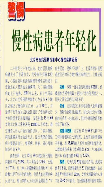 慢性病防治渐渐成为疾控工作的“重头戏”。据本报2001年12月26日16版《警惕慢性病患者年轻化》记载,二十世纪70年代以来,北京居民的疾病谱发生了显著改变,传染病得到基本控制,心脑血管病和恶性肿瘤等慢性病成了威胁北京人健康的主要疾病。为了控制慢性病的上升趋势,2000年以后,北京市疾病预防控制中心在全市8个城区建立了慢性病示范点,选择有代表性的居民社区,针对高血压、糖尿病、肿瘤、冠心病和脑卒中5种慢性病及行为危险因素进行了调查。