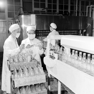 1963年,卫生防疫站的工作人员检查消毒后的汽水瓶。冯文冈/摄