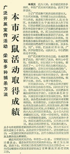 市、区卫生防疫站还组织群众开展了灭鼠活动。卫生防疫站的工作人员对老鼠的分布密度和繁殖规律进行了调查,总结出一些消灭老鼠的办法和措施,向机关、工厂、学校等推广。后来,这项工作成为一项全市经常性的卫生工作。(1963年11月1日《北京日报》2版,《本市灭鼠活动取得成绩》)