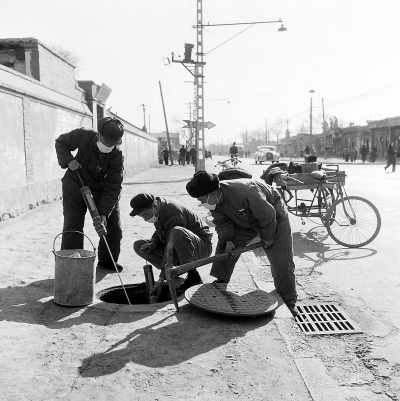 1958年,东四区卫生防疫站的工作人员和市政工人向下水井喷磷化锌消灭沟鼠。冯文冈/摄