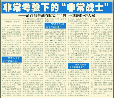本报2003年4月10日1版《非常考验下的“非常战士”》记录了当年的情景:夜深了,北京市疾控中心依然灯火通明。非典应急小分队的60名防疫队员依旧在忙碌着。桌上的几部热线电话铃声不断,市民不断地询问非典症状、防治方法,八位接受过培训的业务骨干不厌其烦地回答着各种提问。一天下来,每个人都要接几十个甚至上百个电话,常常累得连饭都不想吃。在卫生防疫应急处理指挥中心,偌大的屏幕上随时收集着各区县的监测报告,流行病学调查队员们则汇总着当天的信息。如果哪家医院的呼吸科门诊收治了一名疑似非典病人,防疫人员半个小时后就会赶到现场,并对他的上一级传染源和密切接触者进行追踪,切断传染源。