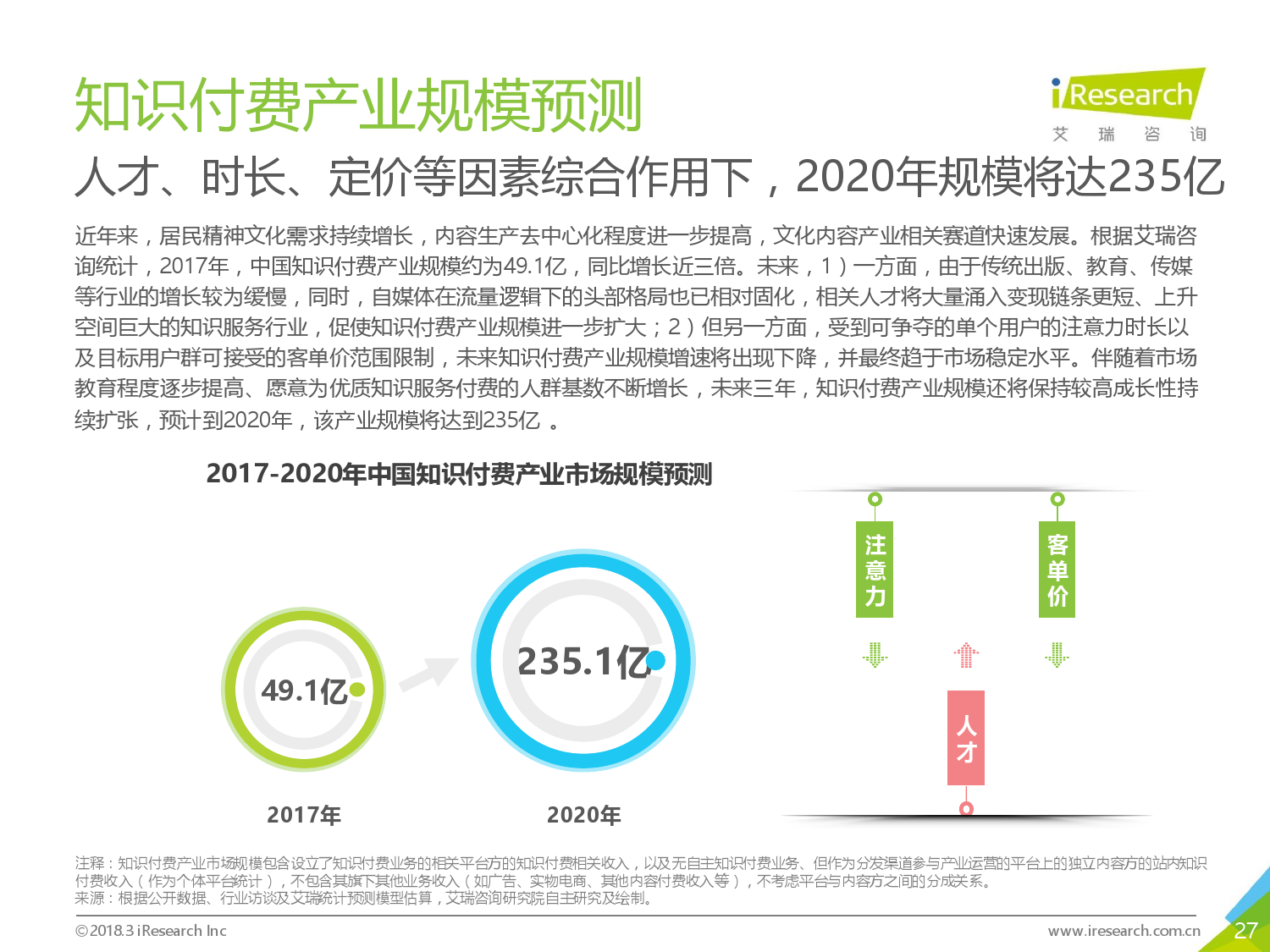 而似乎因为这些第一个吃螃蟹的知识付费平台,用户的付费意愿也被空前的激发。根据各大知识付费平台的运营状况及果壳网、企鹅智库、极光大数据等多项报告估算,仅2016年,有知识付费意愿的用户就暴涨了 3 倍,而知识付费用户达到近 5000 万人。而据艾瑞咨询发布的《2018年中国在线知识付费市场研究报告》显示,尽管2018年中国在线知识付费产品平均复购率仅为30%,但是并未组织知识付费的产业规模进一步扩张,预计到2020年将达到235亿元。