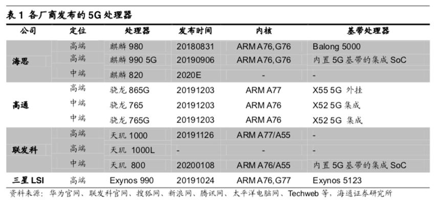 2019年以来,各大厂商集中发布5GSoC方案,目前来看,已经推出手机5G基带芯片的公司分别是华为、高通、三星、联发科和紫光展锐。除了高通之外,其他四家都推出了集成了基带芯片的5G SoC芯片。