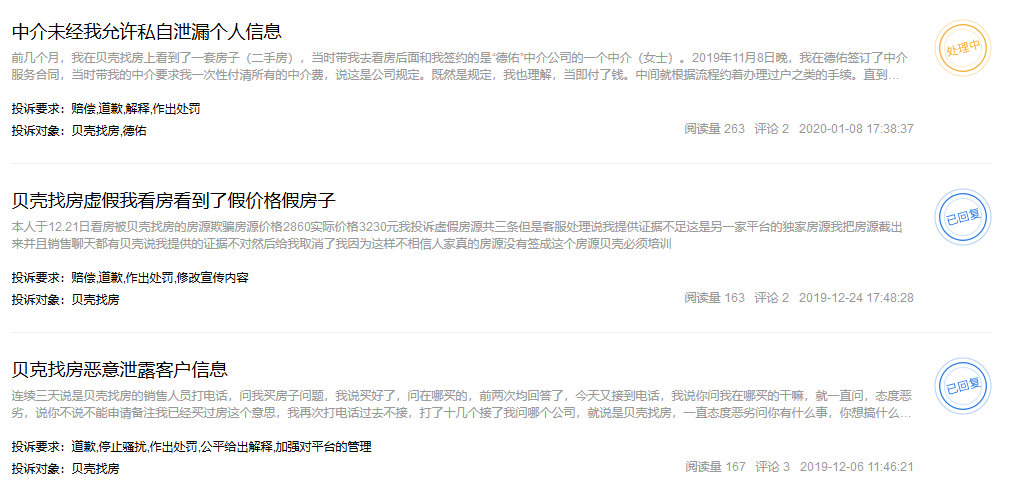 快速扩张之际,贝壳却也麻烦不断。有消费者在某平台投诉称,中介未经同意私自泄露个人隐私。