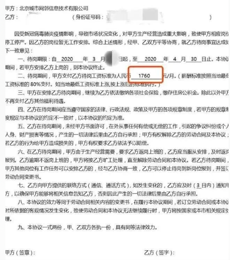 该员工晒出的待岗协议显示,因受冠状病毒疫情影响,导致市场状况变化,对甲方生产经营造成重大影响,致使甲方相应岗位停工停产,乙方岗位暂无工作安排。待岗期限自2020年3月X日起,至2020年4月30日止。待岗期间,甲方支付乙方待岗工资标准为1760元/月(薪酬标准按照当地最低工资标准的80%支付)。