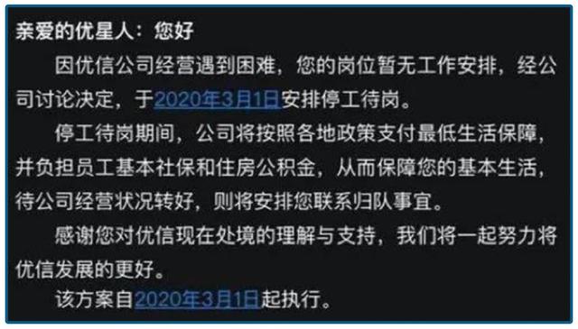 前几天,一封优信集团的内部通知在朋友圈流传,称部分员工从3月1日起停工待岗,基本社保和住房公积金不变,但工资只能按照各地的最低生活保障标准支付。