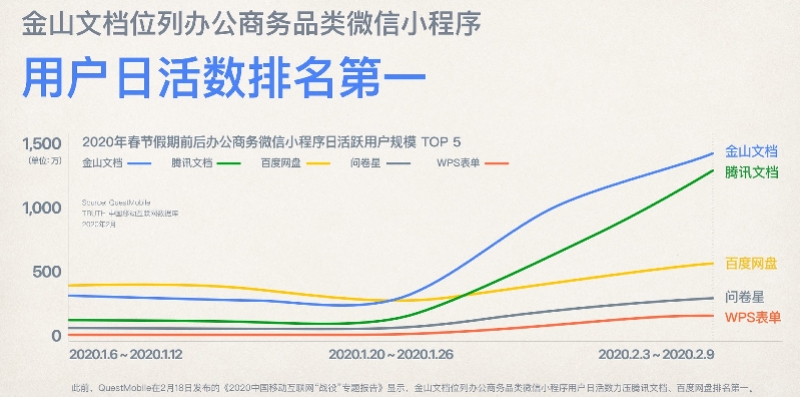 QuestMobile发布的《2020中国移动互联网“战疫”专题报告》显示,2020年春节假期后,由于远程办公、在线学习等需求的上升,效率办公日均活跃用户规模上升了4000万。其中,金山文档位列办公商务品类微信小程序用户日活数量第一位。