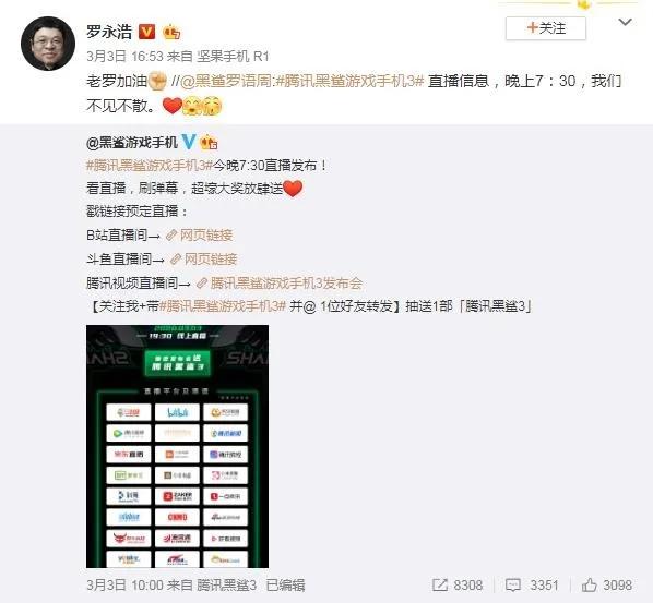 前两天黑鲨手机线上发布最新黑鲨3游戏手机,罗永浩就亲自为小米“站台”,一连转发了好几条关于黑鲨最新手机的微博,亲自下场为小米打call的行为让人们觉得他会不会加入了小米或者黑鲨。
