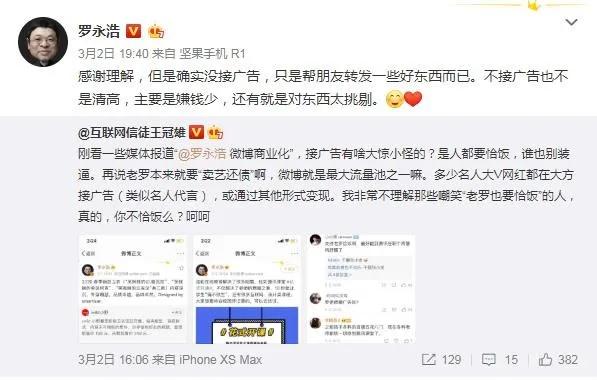 对此老罗回应,没有接广告,只是帮朋友转发一些好东西;不过随后包括小米总裁雷军、副总裁常程都纷纷转发罗永浩的微博,而小米集团的另一位副总裁卢伟冰更是直言“战斗力不如老罗”,就让这件事有了往更加内涵的方向发展的态势,人们纷纷猜测这都是老罗“此地无银三百两”的表现,他有可能真的要加盟小米或者黑鲨。
