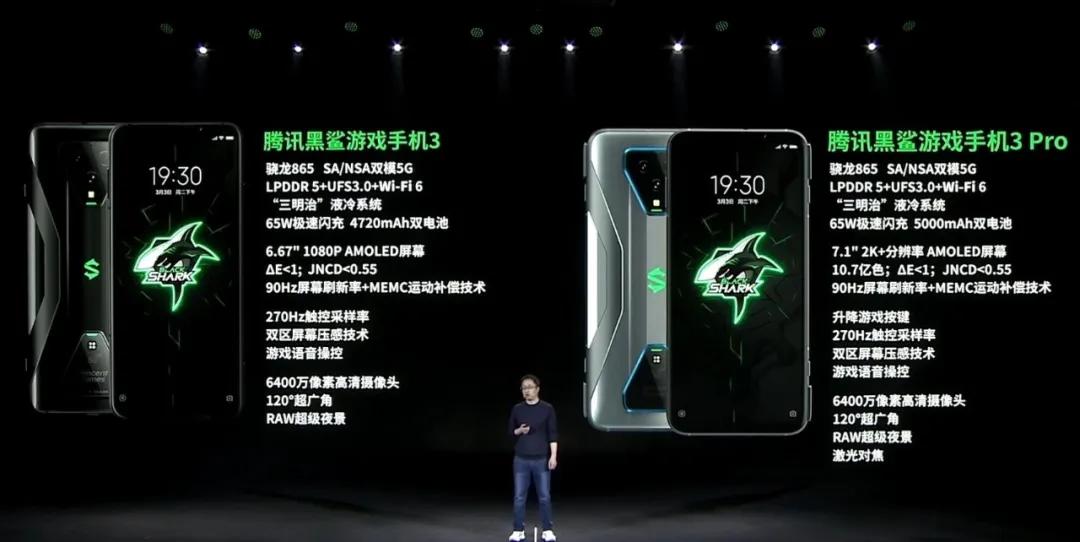 好了闹够了,说回这部新发的黑鲨3吧,新机采用绝对对称外观设计,支持AI灯效,保留3.5mm耳机孔,配置6.67英寸270Hz触控采样率AMOLED屏幕、骁龙865处理器、LPDDR5内存、UFS 3.0内存、Wi-Fi 6、4720mAh双电池、65W快充、三明治液冷散热系统。